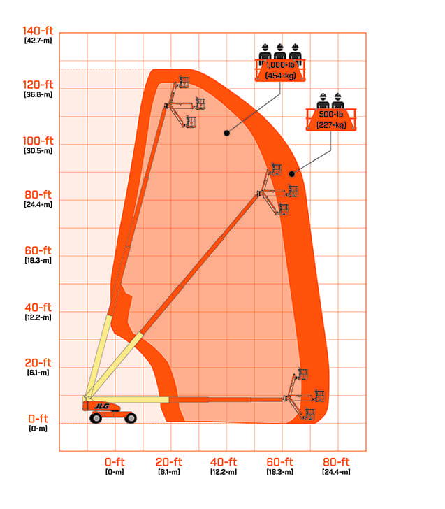 - 38 meter werkhoogte: Met een indrukwekkende reikwijdte van 38 meter biedt deze telescoophoogwerker toegang tot moeilijk bereikbare gebieden en stelt hij u in staat om werkzaamheden op aanzienlijke hoogte uit te voeren.